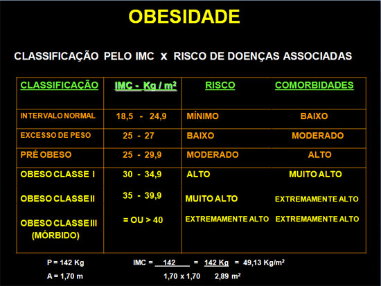 Finalmente, pessoas com IMC acima de 40, são portadoras de obesidade mórbida, o
